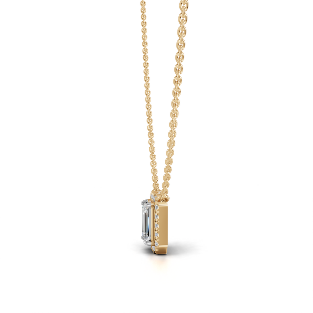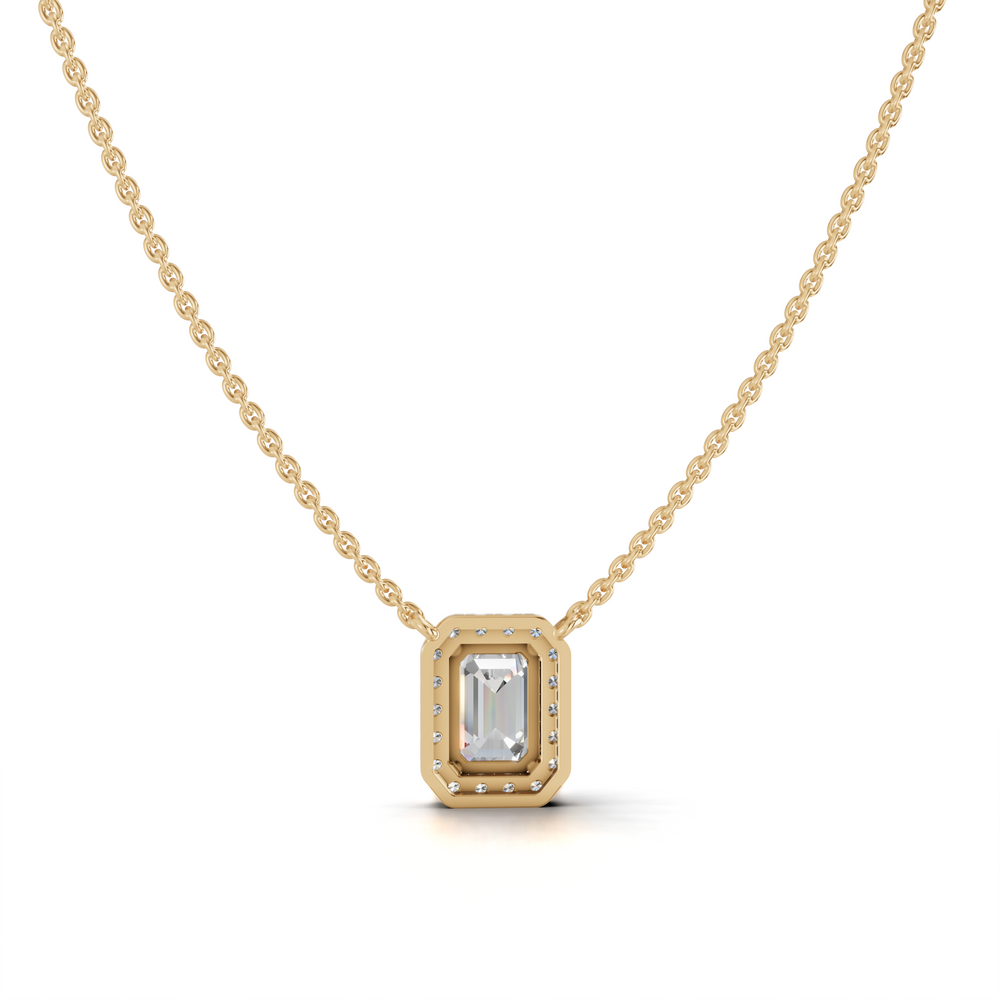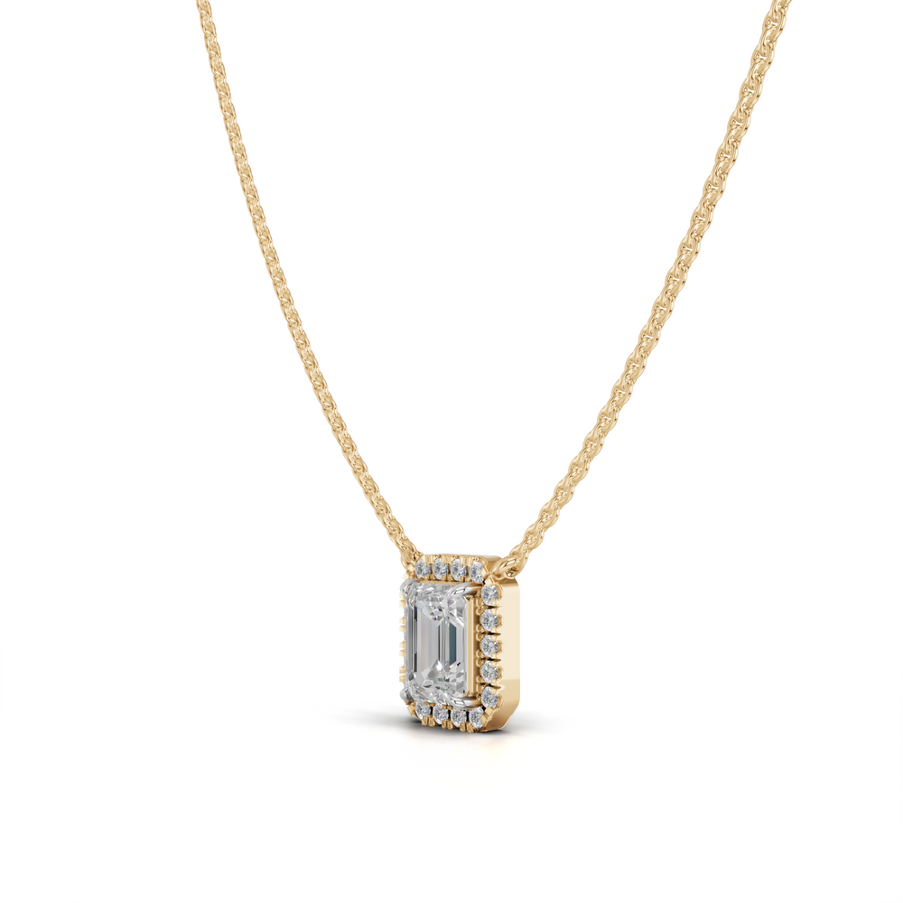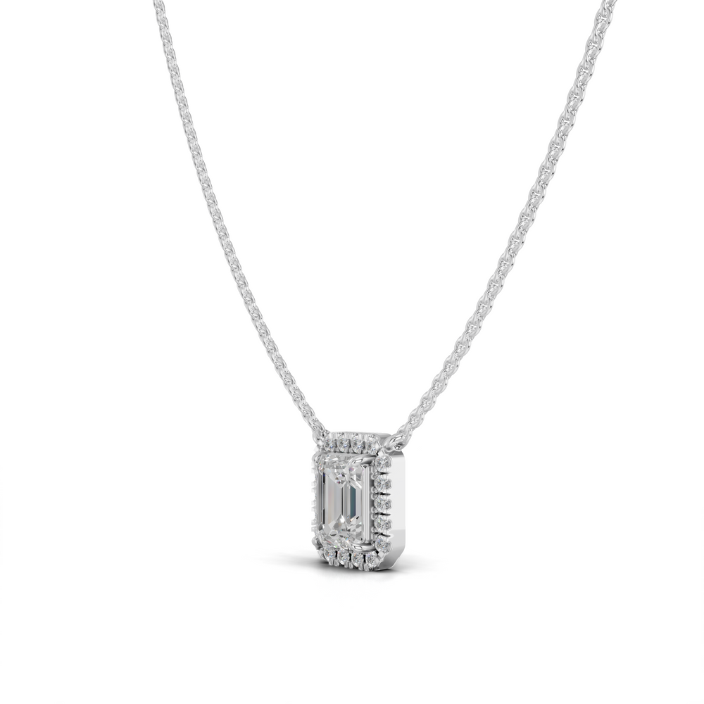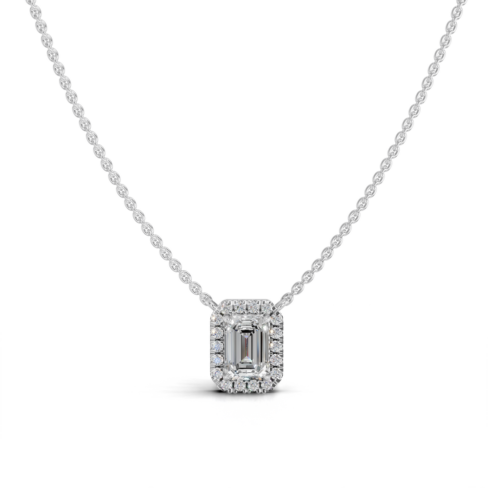 Indulge in timeless elegance with this exquisite Emerald Cut Diamond Halo Pendant Necklace.