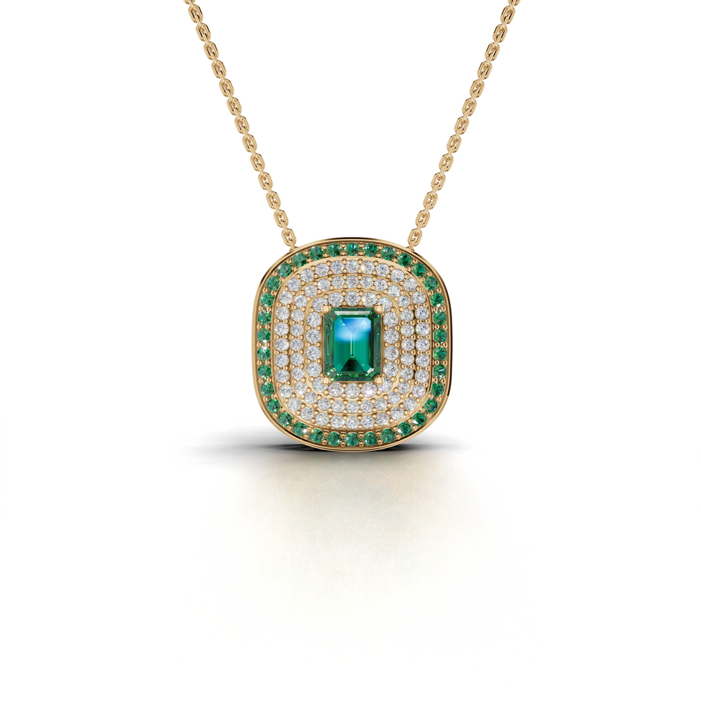 This piece features a captivating emerald-cut emerald, embraced by diamonds and lush green emeralds, all set in...