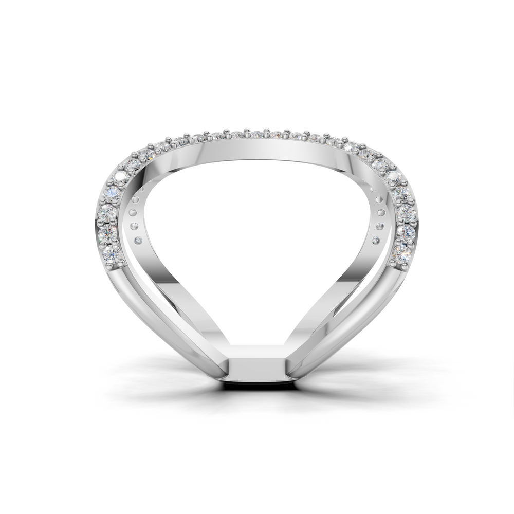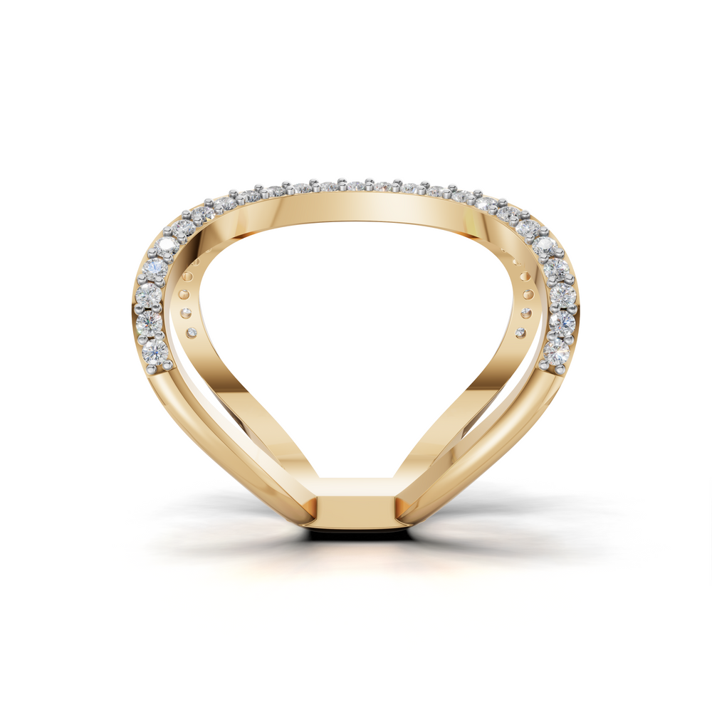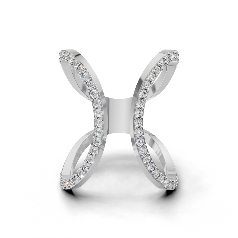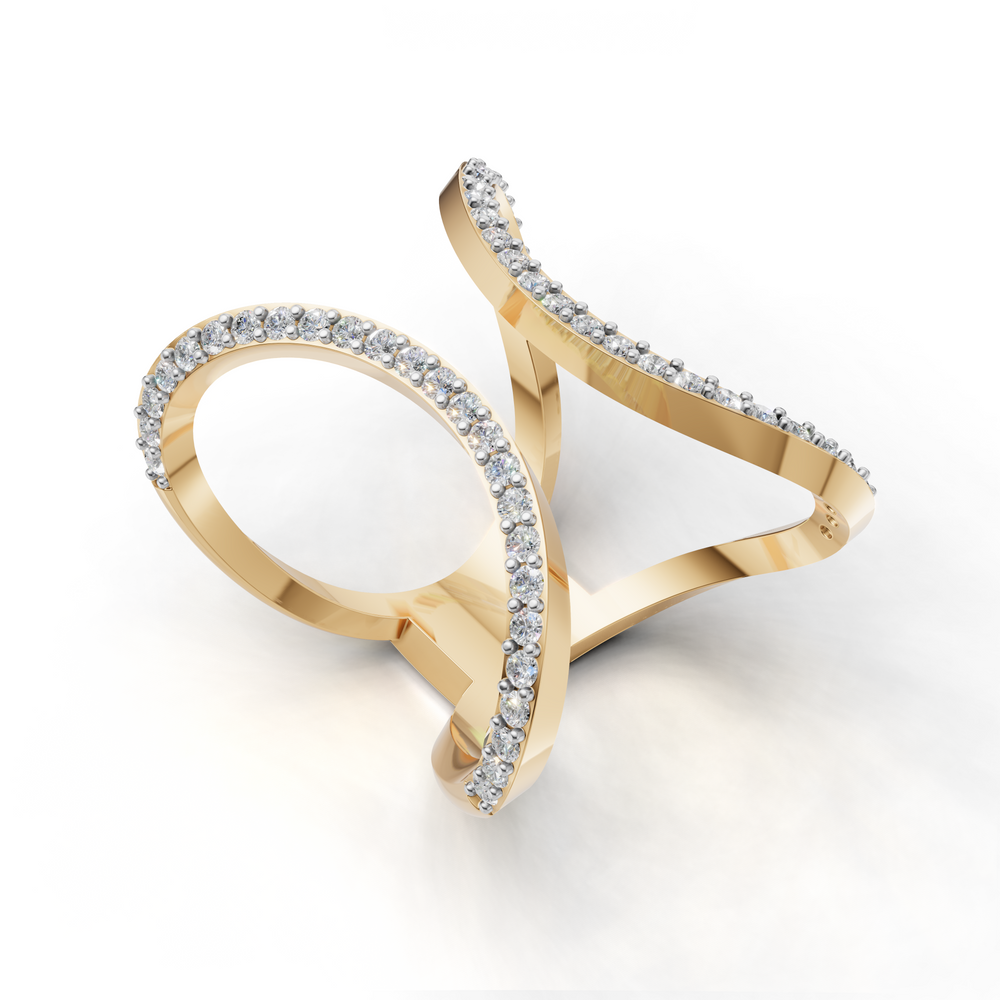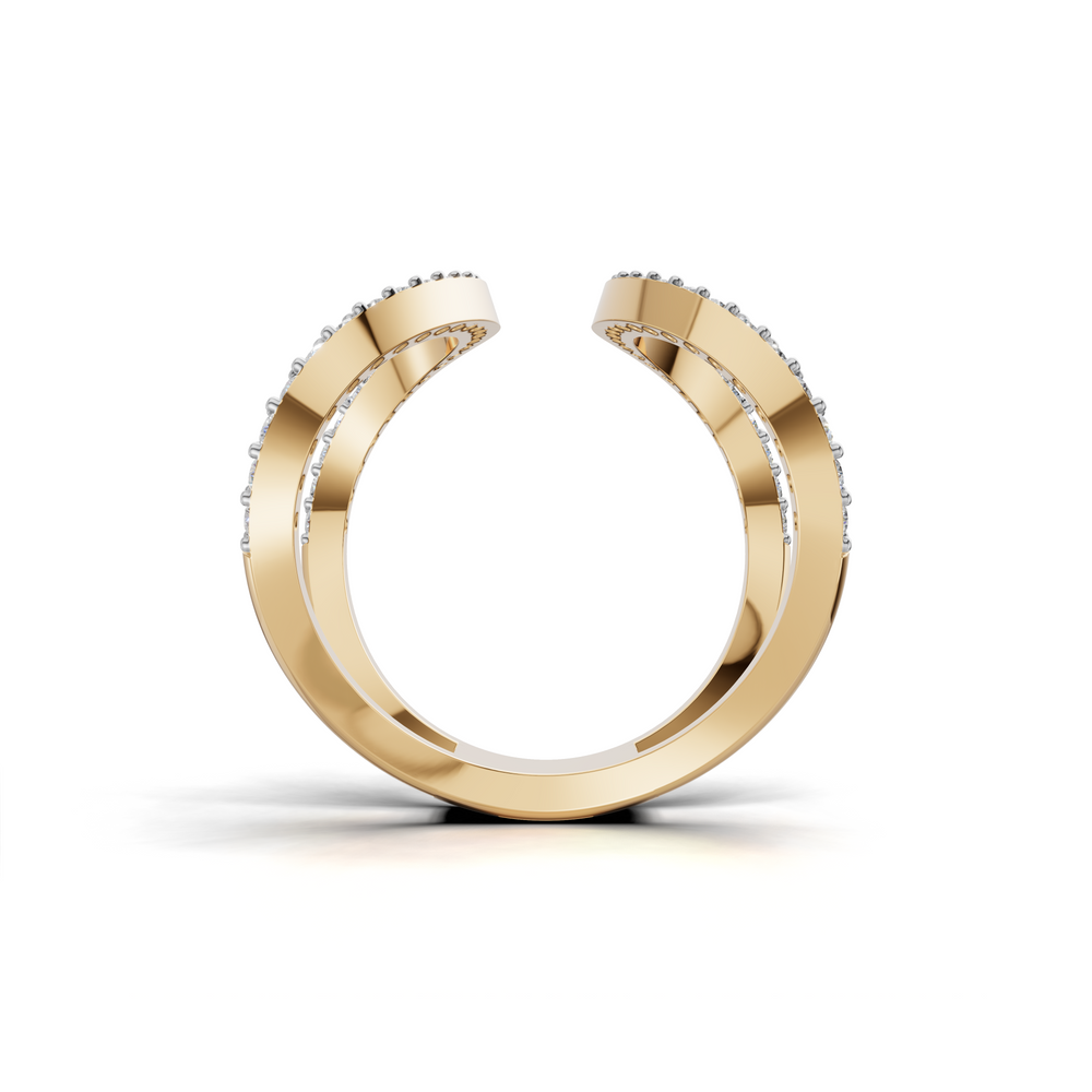The ring features a unique, multi-band design embellished with shimmering diamonds, creating a luxury and high-end feel.
