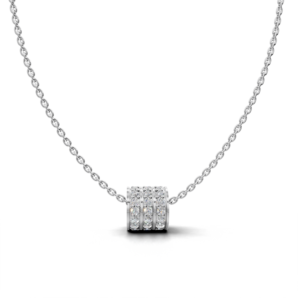 The main feature is a cylindrical pendant adorned with three rows of shimmering diamonds, suspended from a...