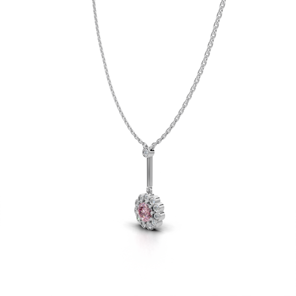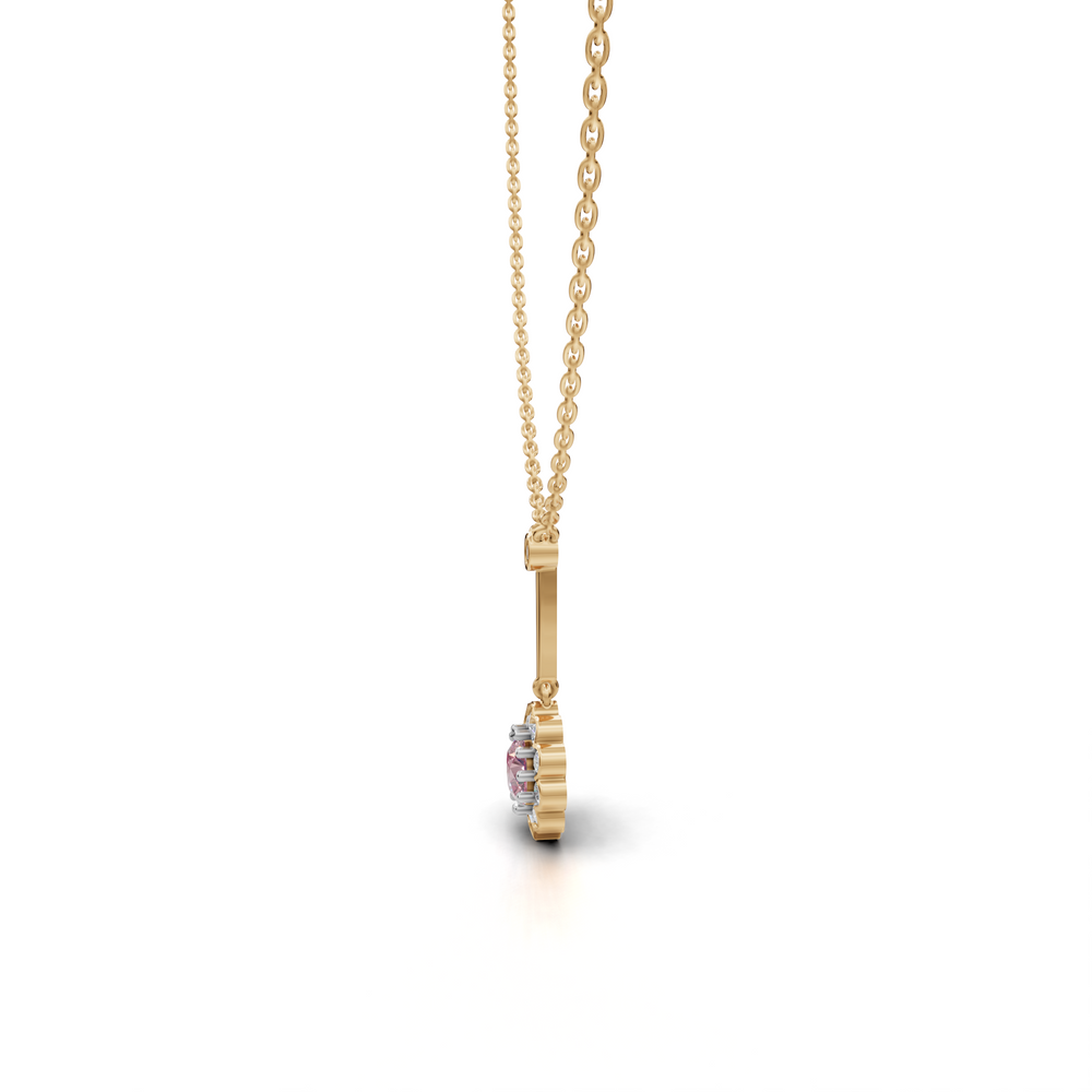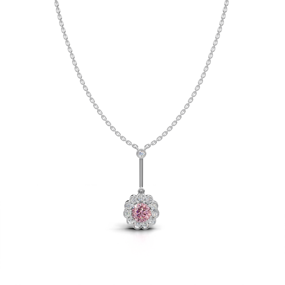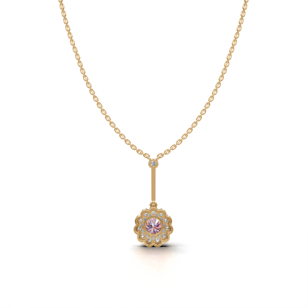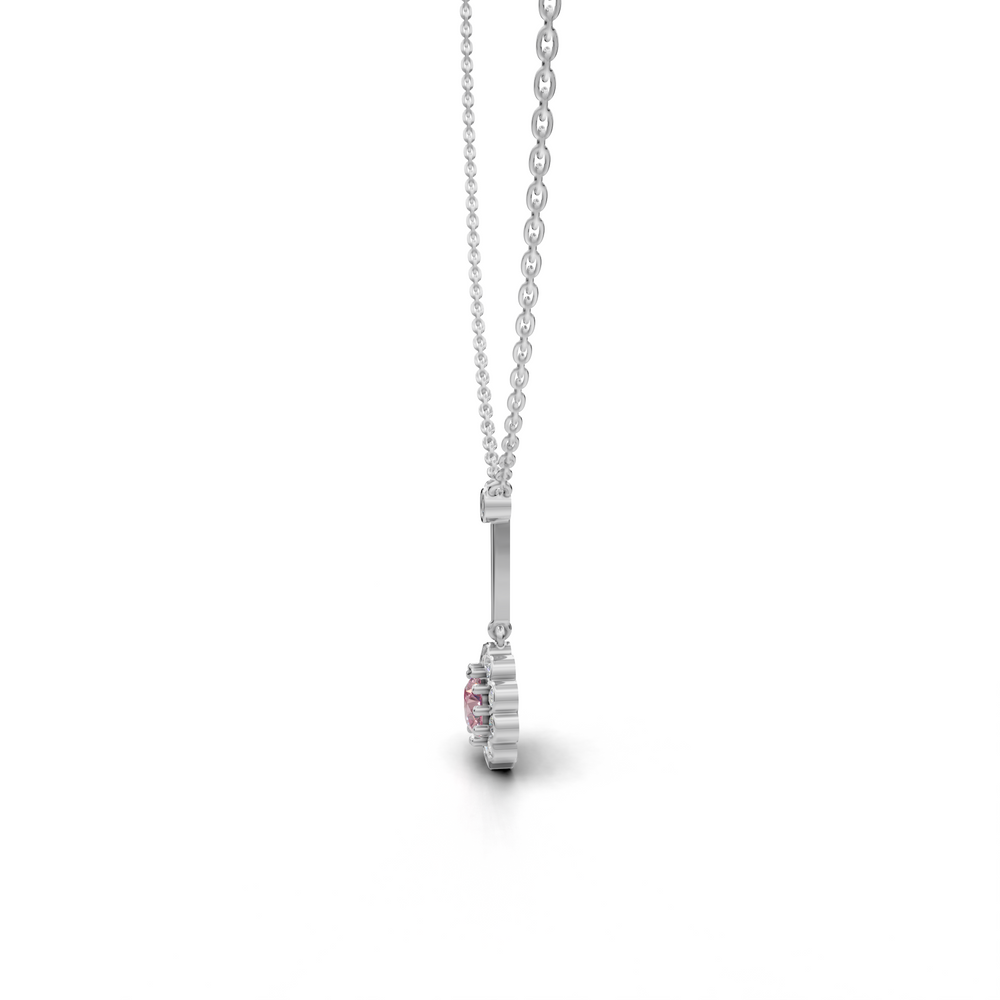 The necklace features a floral-inspired design with a central pink gemstone surrounded by smaller, sparkling diamonds.