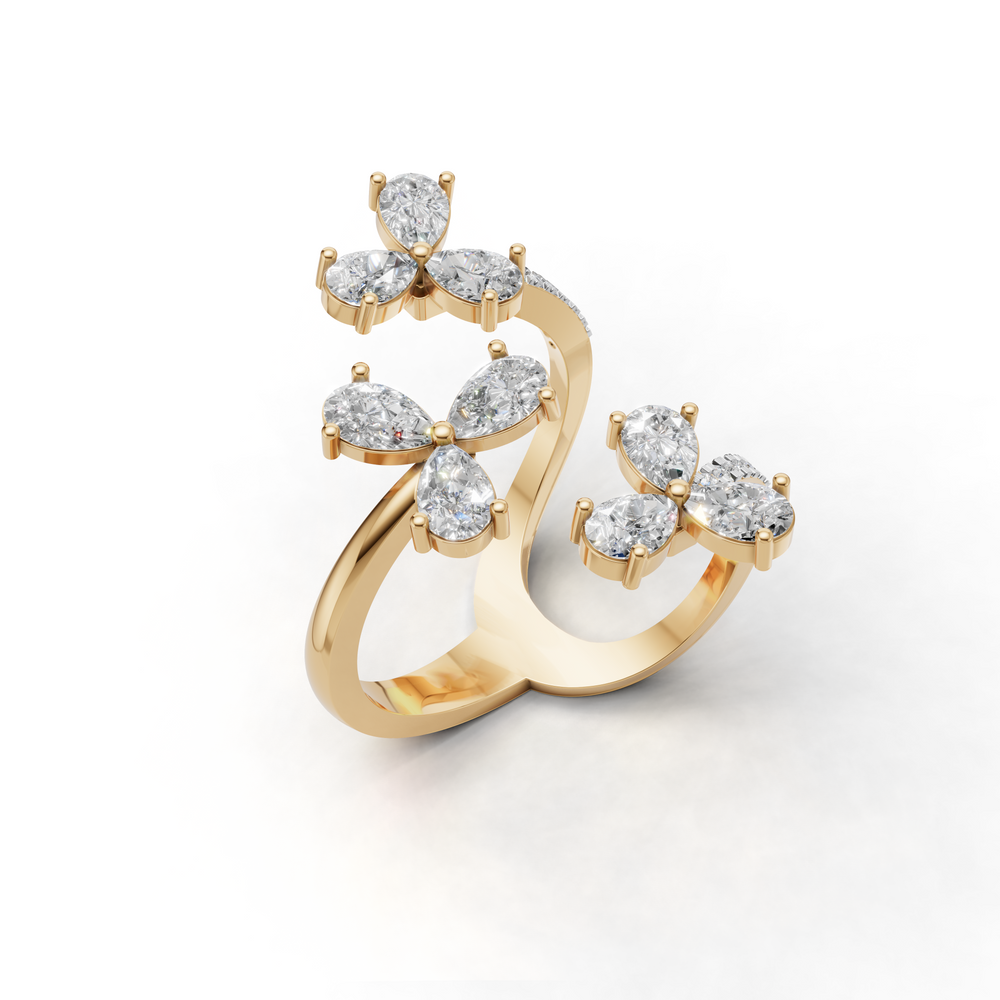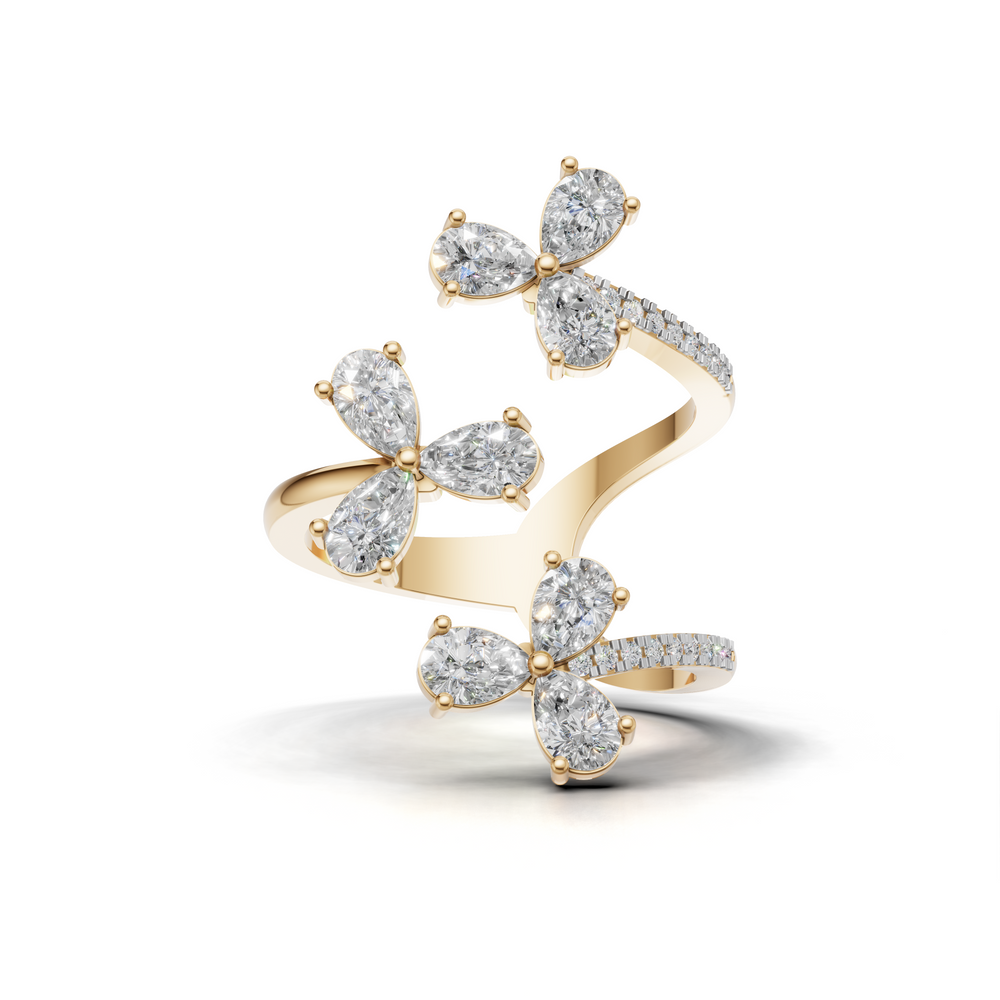 The ring features an open, swirling design adorned with pear-shaped diamond clusters, creating a sense of luxury.