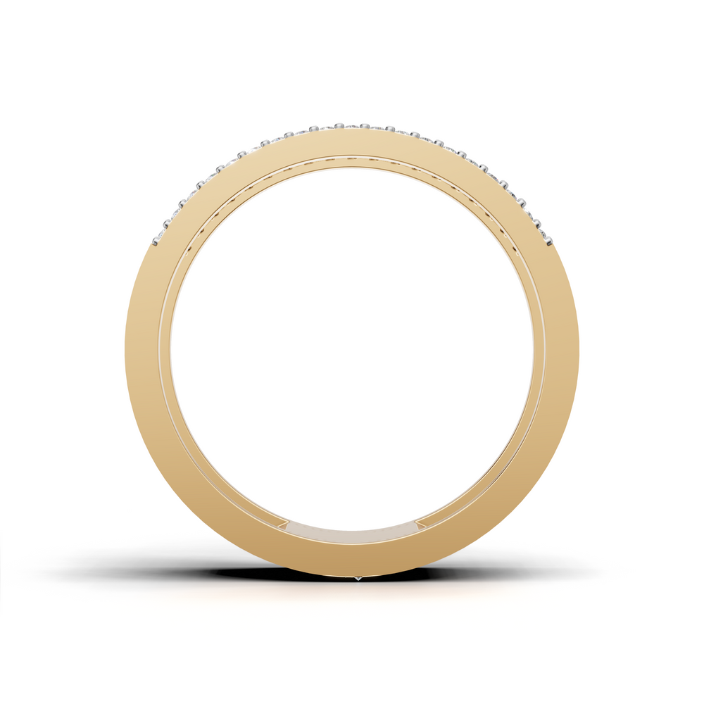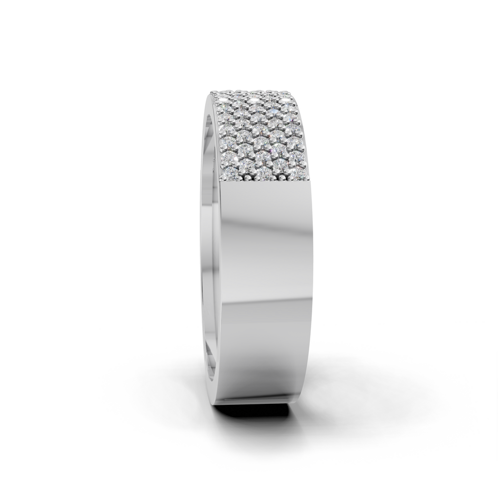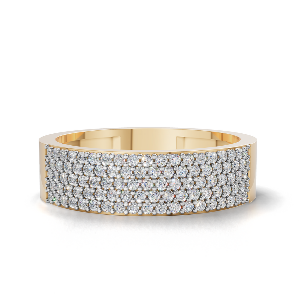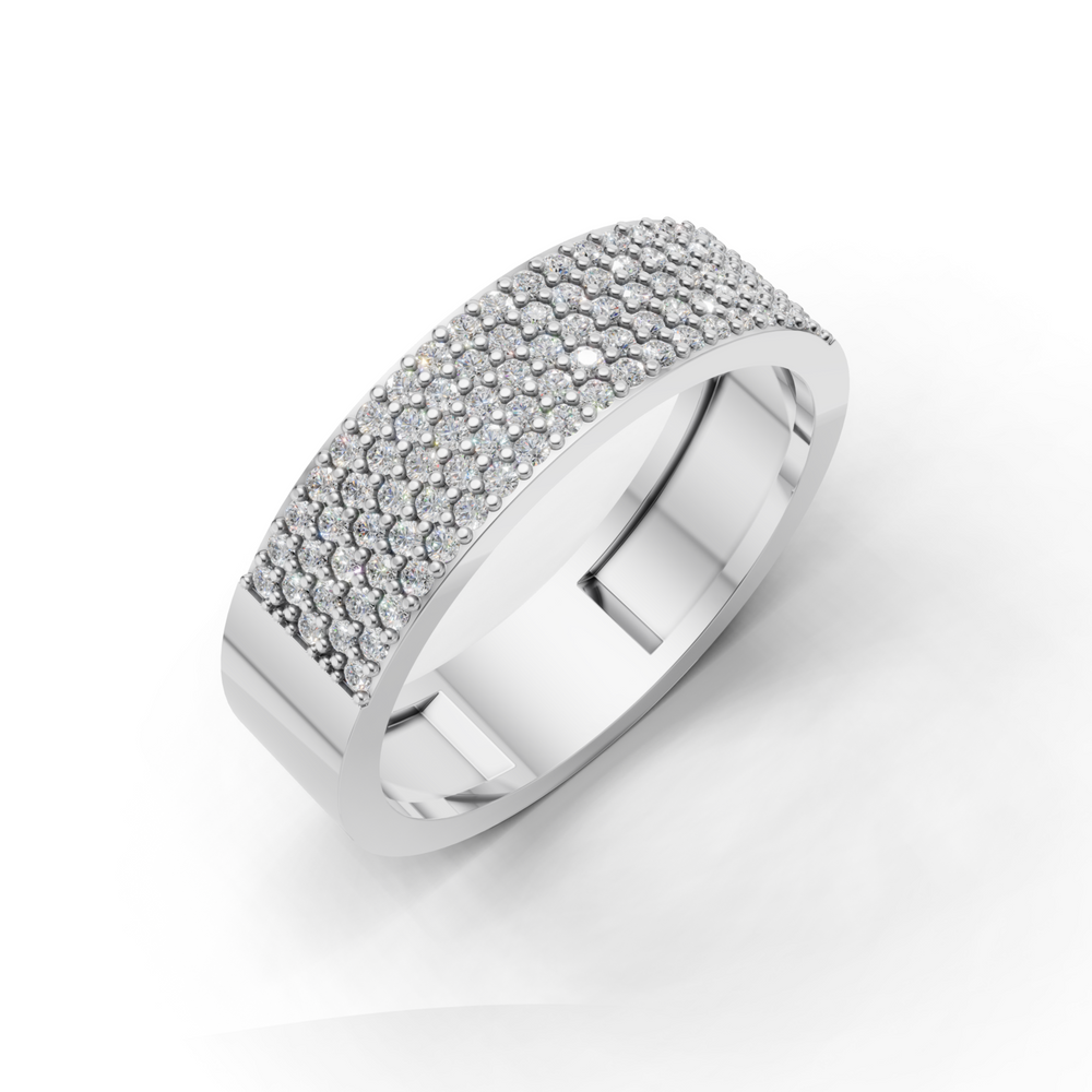 Numerous small, round diamonds are pavé-set across the top surface of the ring.Each diamond contributing to the...